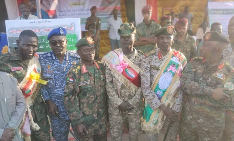 من جهته إمتدح الأستاذ الهادى الهداب ممثل الإدارة الأهلية مجاهدات القوات المسلحة و القوات المساندة لها فى دحر المليشيا المتمردة مؤكدا أن وقوف الشعب السودانى مع جيشه و ملازمته للدعاء للمولى عز وجل قد مكن القوات المسلحة من هزيمة الاوباش و رد كيدهم و كان نائب رئيس لجنة الإستنفار و المقاومة الشعبية بالولاية اللواء ركن معاش عمر محمد مصطفى و رئيس اللجنة المنظمة للإحتفال العقيد شرطة شرفى عيسى قد قدما كلمة خلال الإحتفال .