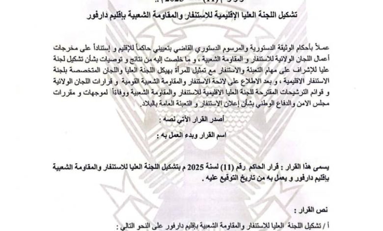 ووجّه مناوي الجهات المختصة باتخاذ جميع الإجراءات اللازمة لتنفيذ القرار فوراً، بما يشمل فتح معسكرات التدريب واستقبال كل أبناء دارفور القادرين على حمل السلاح، استعداداً لمرحلة جديدة لتحرير مدن الإقليم من قبضة المليشيا