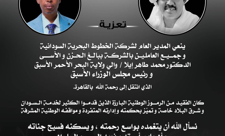 ينعي المدير العام لشركة الخطوط البحرية السودانية وجميع العاملين بالشركة ببالغ الحزن والأسى الدكتور محمد طاهر إيلا، والي ولاية البحر الأحمر الأسبق ورئيس مجلس الوزراء الأسبق، الذي انتقل إلى رحمة الله بالقاهرة.