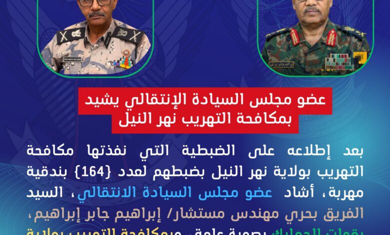 بعد إطلاعه على الضبطية التي نفذتها مكافحة التهريب بولاية نهر النيل بضبطهم لعدد (164) بندقية مهربة، أشاد عضو مجلس السيادة الانتقالي، السيد الفريق بحري مهندس مستشار/ إبراهيم جابر إبراهيم، بقوات الجمارك بصورة عامة، وبمكافحة التهريب بولاية نهر النيل بصورة خاصة، وذلك لدورها البارز في ضبط كميات كبيرة من الأسلحة والذخائر.