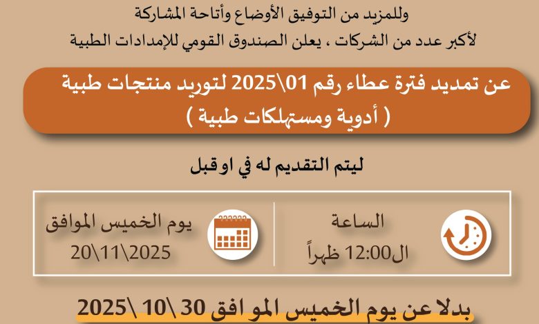 الصندوق القومي للامدادات الطبية إعلان عن تمديد عطاء رقم 01/2025 لتوريد منتجات طبية )أدوية ومستهلكات طبية ليتم التقديم حتى يوم الخميس الموافق 20/11/2025