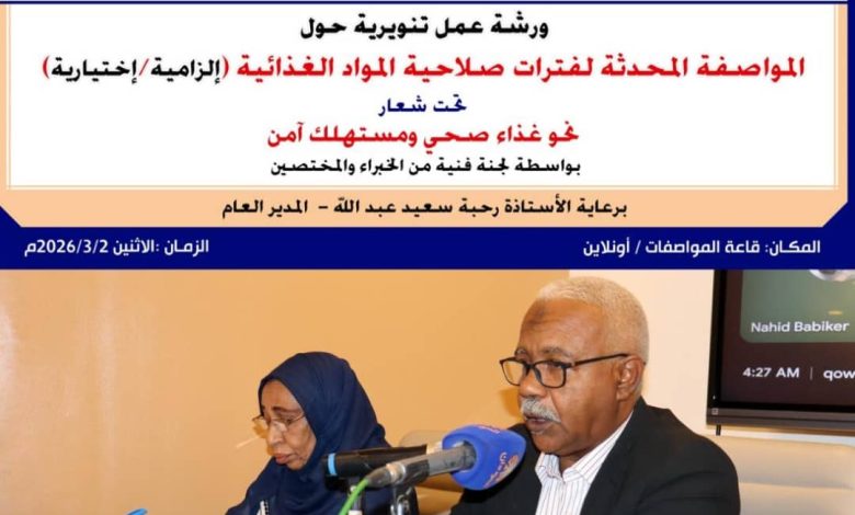 جاء ذلك في تصريح لممثل المدير العام، المهندس التجاني بشير طه مدير إدارة التخطيط والبحوث، خلال الورشة العلمية التي انعقدت بمقر الهيئة السودانية للمواصفات والمقاييس امس بمدينة بورتسودان، حول فترات صلاحية المواد الغذائية، برعاية كريمة من المدير العام الأستاذة رحبة سعيد عبد الله، وبمشاركة أعضاء اللجان الفنية وشركاء الهيئة من مختلف الجهات الحكومية والرقابية وقطاعات الإنتاج والتصنيع والتجارة، إلى جانب خبراء ومختصين ووسائل الإعلام، وذلك عبر حضور مباشر وافتراضي.