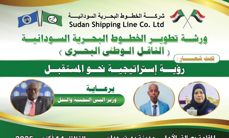 ” تطوير الخطوط البحرية السودانية (الناقل الوطني البحري) و ذلك يوم الثلاثاء المقبل من الساعة التاسعة صباحًا و حتى الواحدة ظهرًا، بصالة “أمل” بمدينة بورتسودان، تحت شعار :