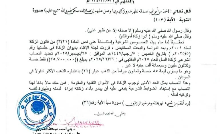 وأوضح الديوان أن قيمة نصاب زكاة المال قد حُدِّدت بمبلغ (35,700,000) خمسة وثلاثين مليونًا وسبعمائة ألف جنيه سوداني، وهو ما يعادل قيمة (85) جرامًا من الذهب عيار (21)، باعتباره العيار الأكثر تداولًا في السودان.