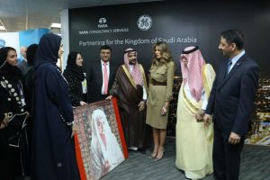 أنفقت الفنانة فاطمة النمر ستة أشهر ، تمكنت من إنجاز لوحة مميزة ، مستخدمة ألوان (أكر لكس) ، بمقاس متر × متر ، اسمتها (المحبة والسلام) ، وتجسد هي الأخرى عظمة المرأة السعودية قديما ، وحديثا ، ومثابراتها كل عام في مجال الطوافة في مواسم الحج ، لتقدم اللوحة ضمن معرض (مسك) ، المقام بالعاصمة السعودية الرياض عام 2010م ، و يتزامن ذلك مع زيارة الرئيس الأمريكي السابق دونالد ترمب ، لتبهر اللوحة عقيلته سيدة البيت الأبيض _ وقتها_ معجبة بها ، ثم تقتنيها ، لتعرض في البيت الأبيض وذكرى لزيارتها ، مناسبة تكشف الفنانة فاطمة النمر النقاب عنها عبر صفحتها الرسمية على منصة (انستقرام) بقولها : “اتشرف باختيار أحد أعمالي المقتناة إلى السيدة الأولى _وقتها_ ميلانيا ترامب كأيقونة معبرة عن ثقافتنا العربية” ، وتظهر اللوحة فتاة عربية الملامح ترتدي وشاحا بلون أبيض ، على خلفية تظهر سجادا بنقوش شرقية.
