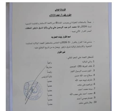 أصدر والي شرق دارفور مولانا محمد ادم عبدالرحمن قراراً ولائياً للعام 2026م قضى بتشكيل لجنة للاستنفار والمقاومة الشعبية، وذلك في إطار تعزيز جهود التعبئة وتنظيم العمل الشعبي خلال المرحلة الراهنة.