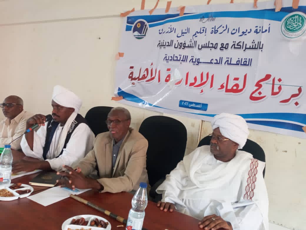 وكان اللقاء محضورا بأهل الدعوة ممثلا في الشيخ صديق يوسف محمد احمد رئيس مجلس الشئؤن الدينية ونائبة الشيخ صلاح باسوم فاثني الشيخ صديق علي حسن صنيع ديوان الزكاة في تسيير القافلة الدعوية وما قامت به من عمل دعوي كبير عبر المنابر ودور المؤمنات والأجهزة الإعلامية ولقاء أطراف النزاع ليمضي اللقاء بالادارة الأهلية والحديث تبادلا بين أعضاء القافلة والكل يثني علي اهل النيل الأزرق ويذكر قوة اواصرهم لياتي حديث الدكتورعثمان محمد دفع الله القرجي كرجل إدارة أهلية يعرف الوصول الي قلوب المتخاصمين مذكرا بامجاد اهل السلطنة الزرقاء ودور الأجداد في إقامة دولة الإسلام بعد افول شمسها في الأندلس لتشرق هنا في أكبر تحالف بين الفونج والعبدلاب مؤكدا الثقة في قدرة اهل الإدارة الأهلية علي تجاوز الاذمة ليتواصل بعده الدكتور أسامة حسن مدير إدارة التخطيط والسياسات بوزارة الشئؤن الدينية والأوقاف مركزا علي قيمة العفو والتسامح واعمار الحياة بالخير والفضيلة كهدف من أهداف القافلة التي جاءت تحت شعار((ومن احياها كأنما أحيا الناس جميعا )) مذكرا بما قامت عليه دولة المدينة في عهد رسول الله علية وسلم من تاخي بين القبائل وتصاهر بينها مؤكدا علي قدرة رجال السلطنة من إعادة الأمور الي نصابها ليتواصل الحديث مع الدكتور عصام محمد علي امير القافلة مثمنا دور ديوان الزكاة بالأمانة العامة والإقليم حيث لم يكتفي الديوان بالدعم المادي فراي ضرورة دعم التعايش السلمي ورتق النسيج الاجتماعي بقدوم هذه القافلة وابدي الدكتور عصام استغرابه لما حدث بأن جميع الأطراف الذين التقتهم القافلة مستنكرين ما حدث وراغبين في التصالح مؤكدا الحاجة لعمل مستمر يوصل الي الصلح والتسامح ويزيل ما تبقي من احتقان في نفوس البعض مشيدا بمواقف كل الأطراف وحسن نوايها ليتآزر ذلك مع جهد القوات النظامية للوصول بالإقليم الي بر الأمانة