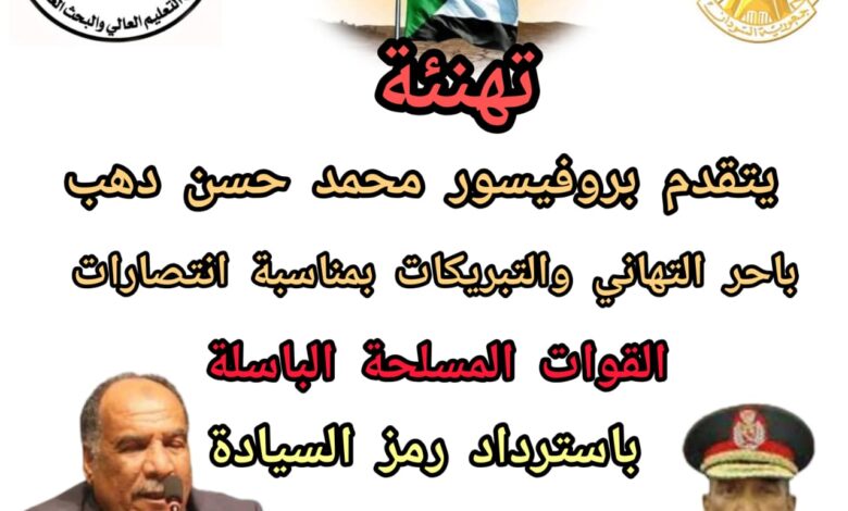 يتقدّم بروفيسور محمد حسن دهب وزير التعليم العالي والبحث العلمي وإنابة عن العاملين بالوزارة ومؤسسات التعليم العالي والبحث العلمي إلى فخامة رئيس مجلس السيادة القائد العام لقوات الشعب المسلحة والسادة أعضاء المجلس السيادى الموقرين وإلى الشعب السوداني المثابر الصابر القوي، بأسمى آيات التهاني والتبريكات بمناسبة الانتصارات العظيمة والمتوالية التي حققتها قوات الشعب المسلحة والأجهزة الأمنية الأخرى في كافة المحاور ، وتهنئة خالصة صادقة باسترداد القصر الجمهوري رمز السيادة الوطنية في أقوى المعارك عنوة واقتدارا، جسدت فيها قواتنا الباسلة معاني الشجاعة والتضحيات لأبناء الوطن الخلص الأوفياء.
