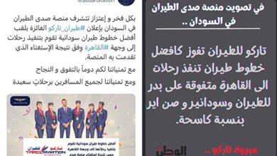 الخرطوم :البلد نيوز حصلت شركة تاركو للطيران على لقب أفضل خطوط طيران تنفذ رحلات من الخرطوم الى العاصمة المصرية القاهرة…