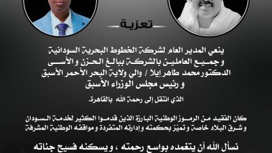 ينعي المدير العام لشركة الخطوط البحرية السودانية وجميع العاملين بالشركة ببالغ الحزن والأسى الدكتور محمد طاهر إيلا، والي…